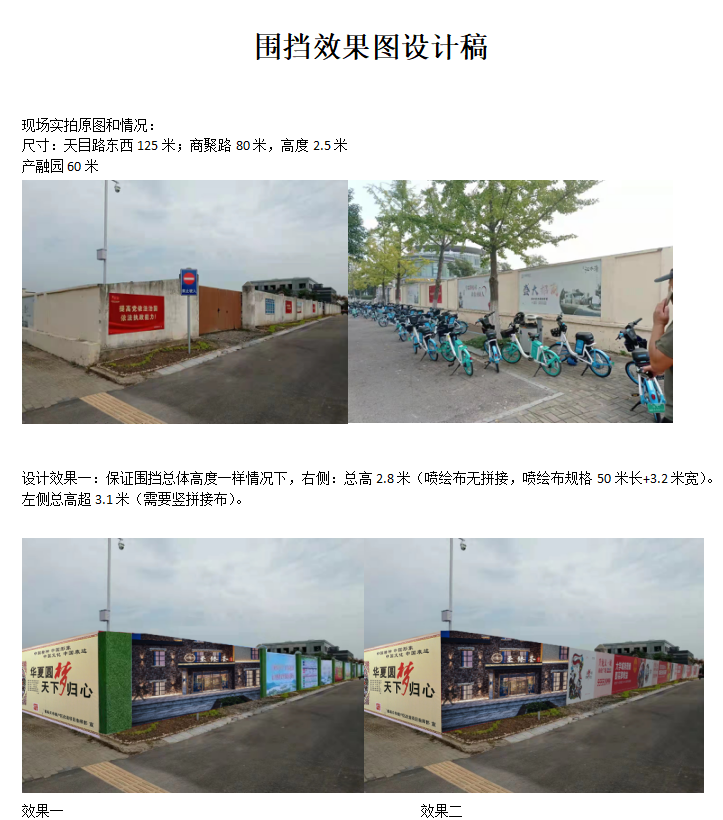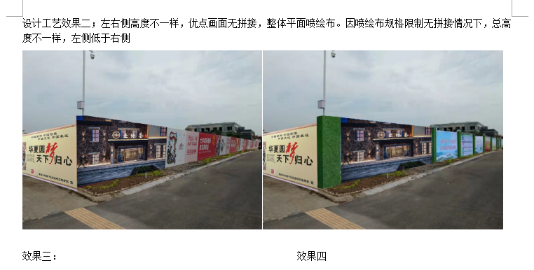 设计效果一:保证围挡总体高度一样情况下,右侧:总高2.8米(喷绘布无拼接,喷绘布规格50米长+3.2米宽)。左侧总高超3.1米(需要竖拼接布)。