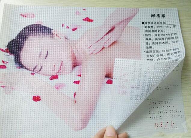 网格布:和单透差不多,都是利用光学原理,布上布满小孔,然后在布上打印画面后,在亮处的一面可以看到画面,在暗处的一面可以透过小孔看到布后面的景色,一般适用于外表为透明玻璃的商场之类,使人在商场外面只能看到商场外墙上的画面,在商场内部可以透过玻璃和网格布看到外面的景色。