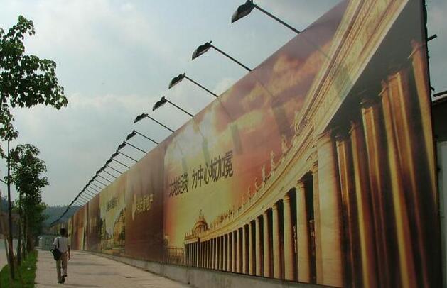 围挡基脚采用M10水泥砂浆砌筑MU10页岩砖砖砌0.5*0.5的基础,用于增强围挡抗风稳定性;pvc围挡设2.5米高,宽3米为一板。施工围挡做美化处理,喷涂企业名称、安全、质量、文明施工用语及开发项目商业广告,严禁张贴、涂写垃圾广告。