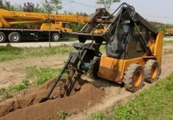 开沟机属具是滑移属具的一种,通过滑移装载机的液压驱动力实现开沟属具的土壤切割。开沟深度和宽度可调,开沟效率是人工的数十倍。可以开挖排水渠、铺设水管、电缆等相对松软的土壤。对于硬度较大的土壤还能增加开沟齿等方式实现开掘作业。