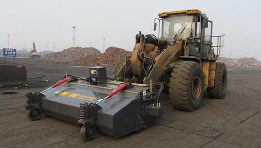 8. 本清扫器设计有四个实心胎万向轮,确保清扫器的行驶平顺性和机动性,使装载机在转向时也可以作业,确保了轮胎的安全和使用寿命。前轮设计有防冲击抗震装置,确保清扫器在不平整场地的安全作业,后轮内部设有平面轴承,在重载情况下保证万向轮360°顺畅旋转。