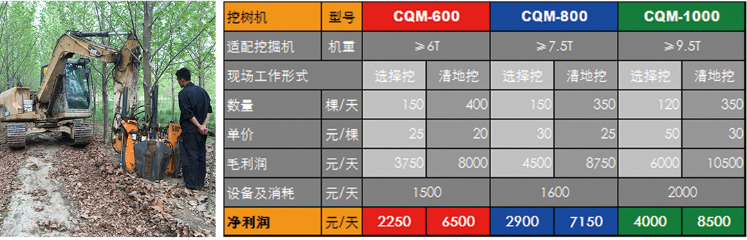 CQM-800型号常青带土球挖树机一天可挖树150-350棵树,每棵树单价大约25-30元,设备及消耗费用每天约1600元,纯利润每天最多可达7150元.