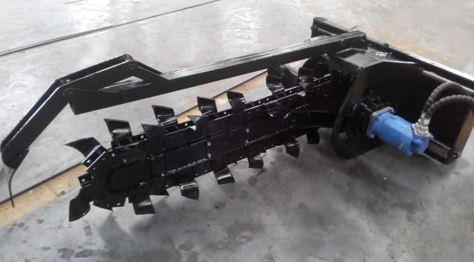 本实用新型涉及一种挖沟开槽设备装置,具体是一种用于铺设农田管道、城乡光电缆等所用到的链条式开沟机。根据客户需要研发设计而成,专为滑移装载机,挖掘机做配套使用的新型开沟设备。它是在普通主机上通过安装超低速变速器实现低速缓行,从而使沟深上下统一,宽度左右匀称。该机采用回旋式开沟器,开沟宽度为10—30厘米,开沟深度可调,最大开沟深度为150厘米,开沟速度每小时可达100—300 米。所开沟形沟直、壁陡,沟深和沟宽统一,人工和挖掘机无法开出此沟形。主要适用于农田水利灌溉地地下管道,自来水管道及地下电缆铺设等项工作的开沟作业。·经济效益显著:购买该机器,投资少,见效快,一台机器能替代几十个人的工作,还不用操心工人的吃住等一些杂事;